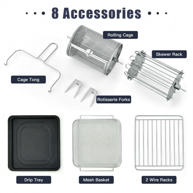 2.8 Extra Accessories & Considerate Design: This air fryer oven comes with 8 useful cooking accessories including rotisserie forks, cage tong, skewer rack, rolling cage, drip tray, mesh basket, 2 wire racks.