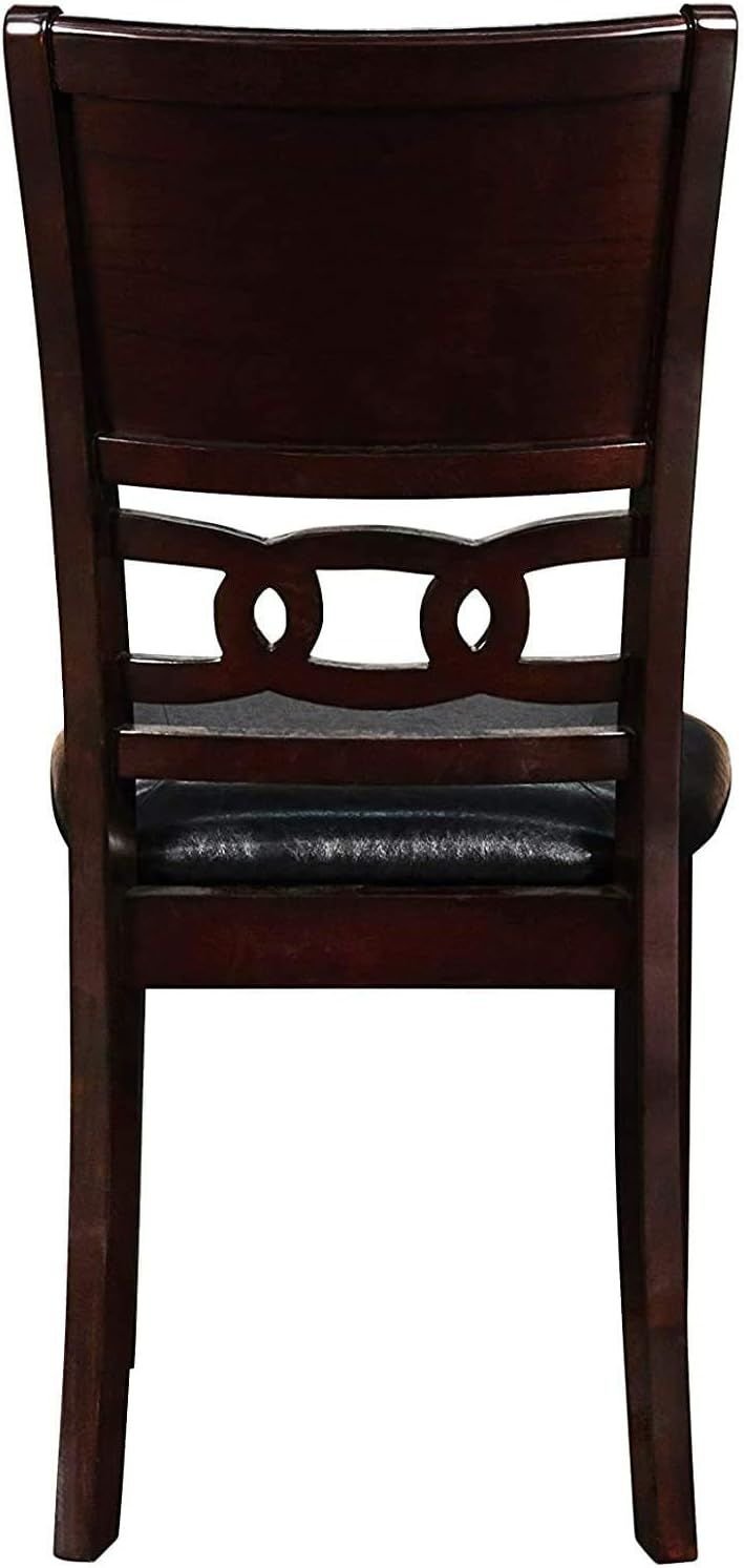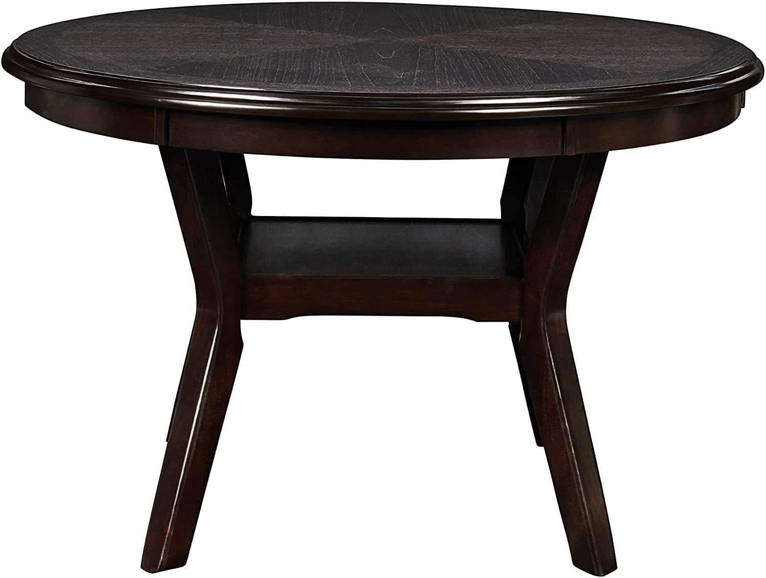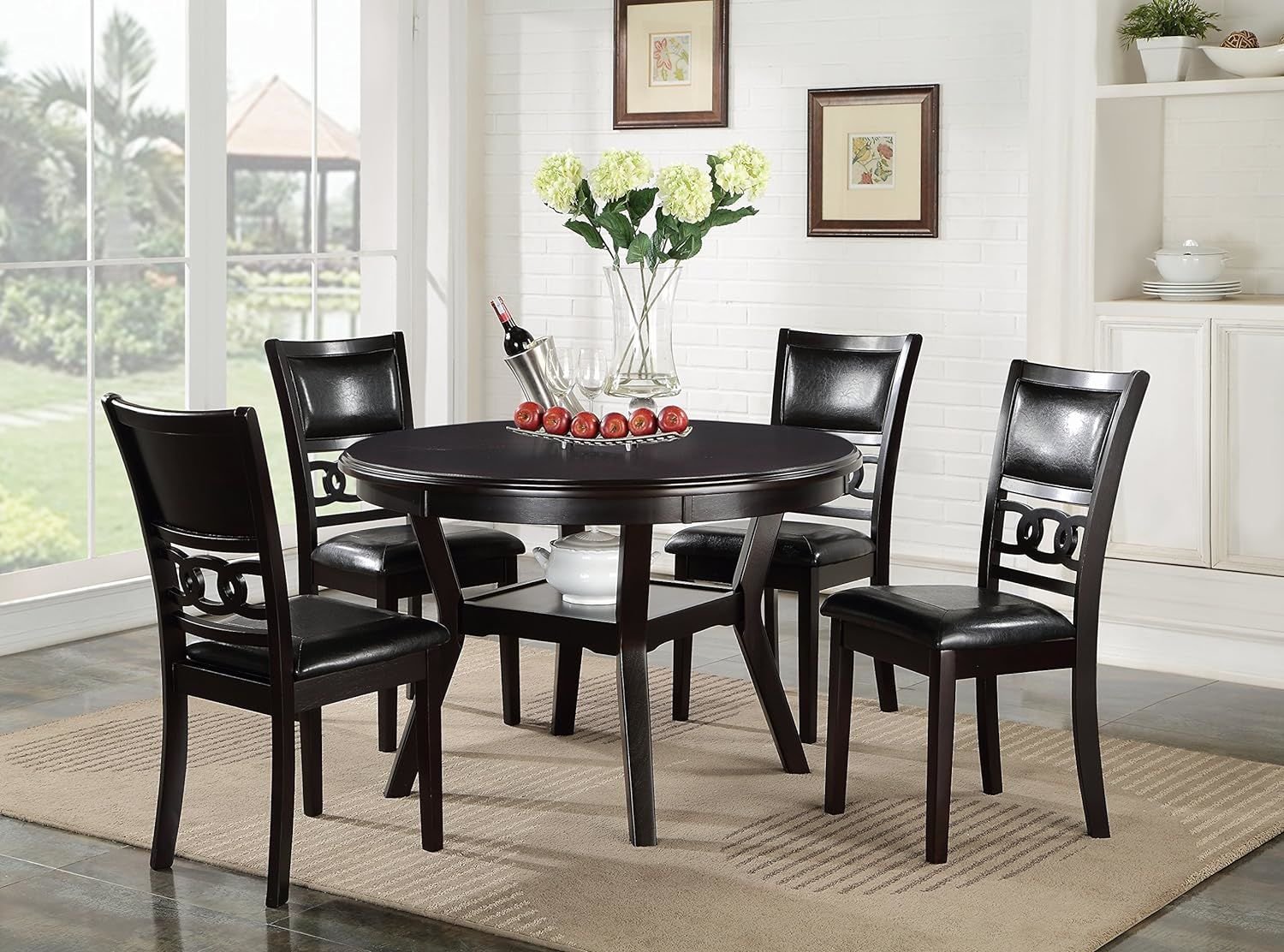 5-Piece Dining Set, EbonyEntertain your guests comfortably with this stunning 5-Piece round Dining set. This set comes with a beautiful round table with four matching wood Dining Chairs. The substantial wood dining table apron supports a beautiful tabletop enhanced with reverse diamond-patterned veneers. The legs of the dining table flare out and support a handy storage shelf suitable for dinnerware or decorative accessories. Distinctive Dining Chairs have nicely padded seats with attractive interlocking circle pattern wood backs.