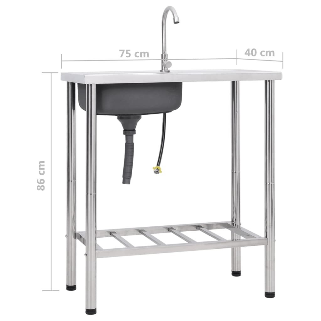 Made of stainless steel, this garden kitchen is scratch and impact resistant, highly durable and able for food contact. It is also dirt-repellent and stain resistant, thus easy to clean. The extra-deep basin has ample space for washing large pans and dishes. The drainboard comes in very handy not only when washing dishes by hand but also as an extra place for cutting vegetables. Additionally, the sink is easy to transport.Color: SilverMaterial: Stainless steelSink dimensions: 29.5" x 15.7" x 5.9" (L x W x H)Bottom frame dimensions: 28.7" x 15" x 33.9" (L x W x H)Assembly required: Yes