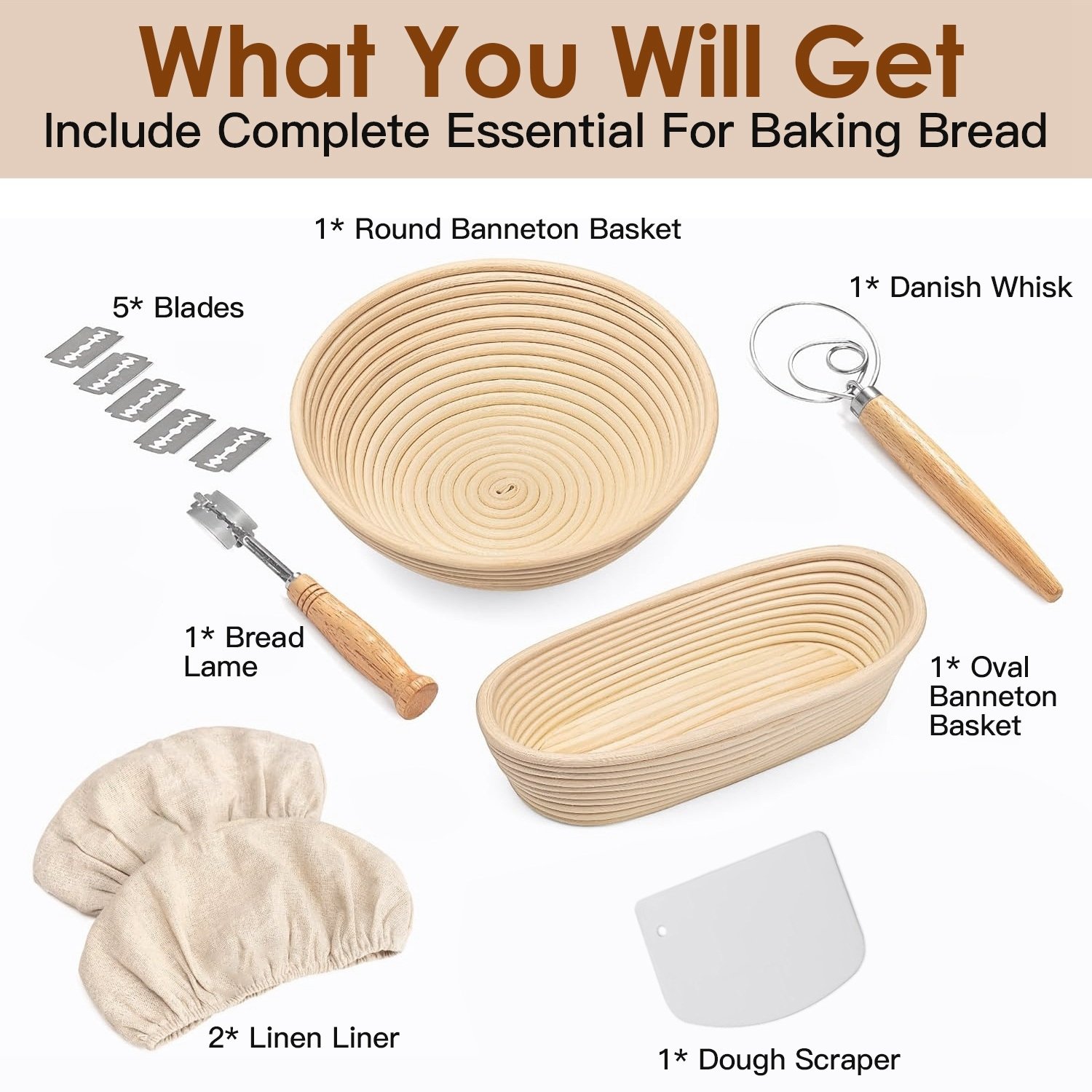 Home > Complete Bread Baking Kit Banneton Proofing Basket Set 9In Round And 10In Oval Basket With Linen Liner Lame Dough Scraper Blender Whisk