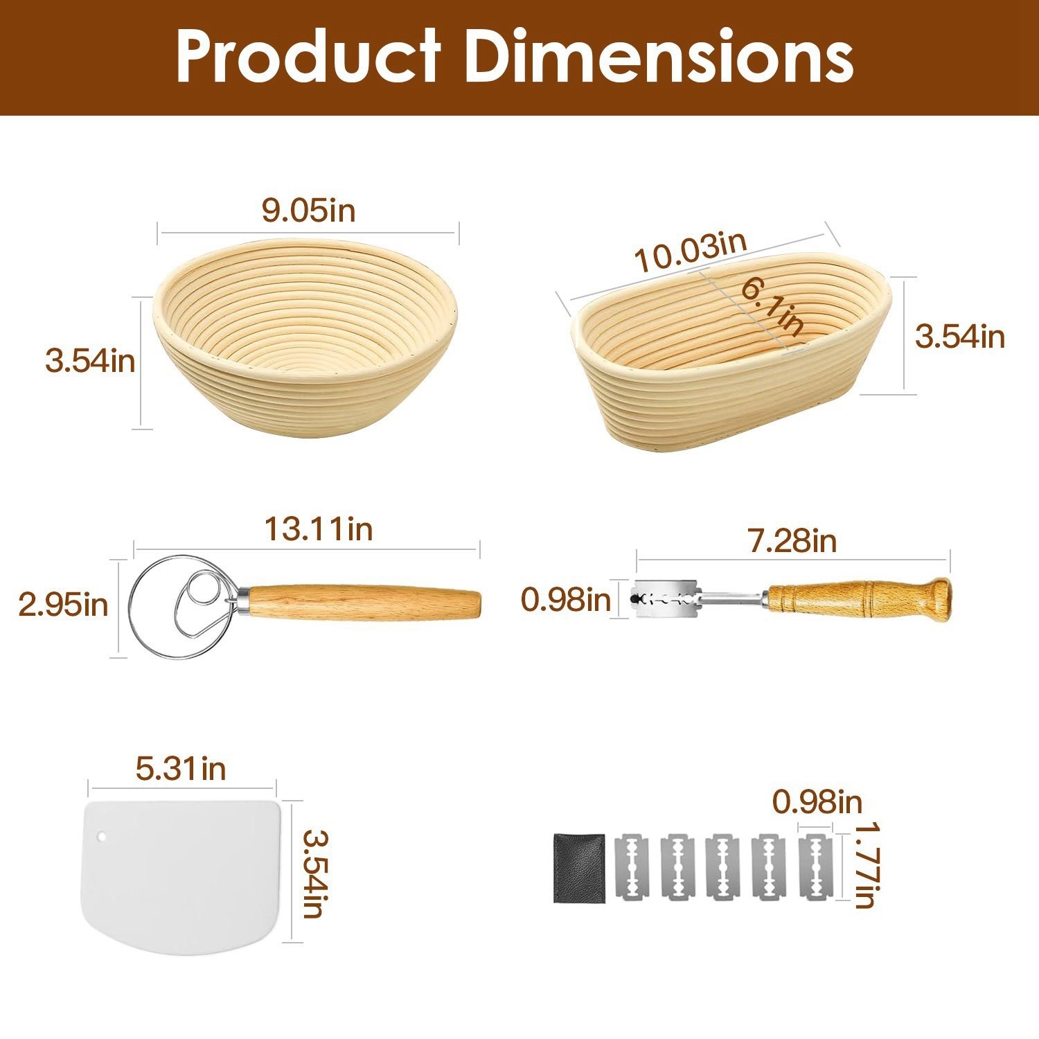 *Natural Rattan & Wood*:The banneton baskets are made of natural,odorless and non-toxic rattan,with mold-resistant linen cloth,creating an ideal proofing and rising environment for yummy breads. Moreover,the sturdy,durable wooden handle of Danish whisk and bread lame deliver smooth and ergonomic grip experience.