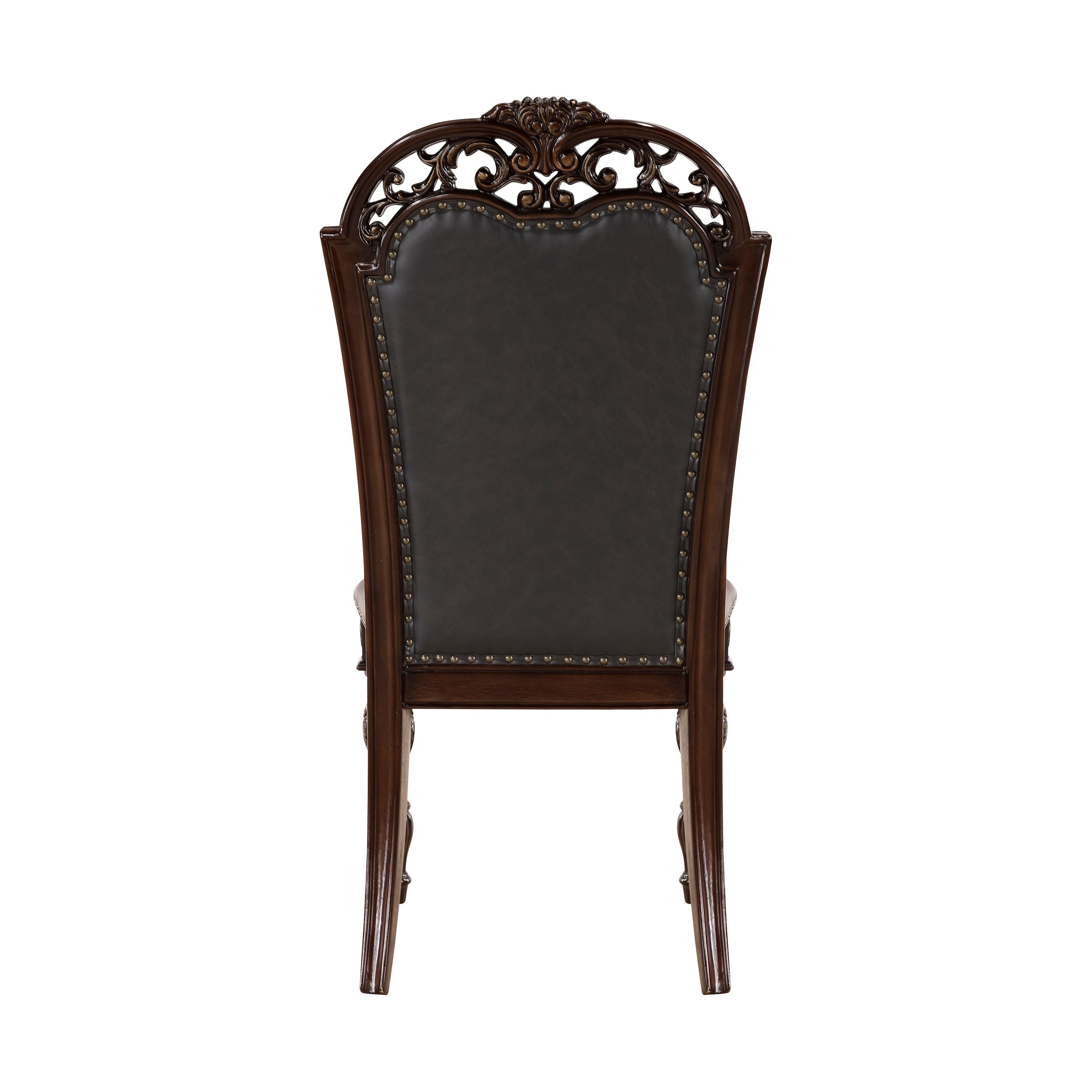 Description & DimensionsRich in the aesthetic of Old-World tradition, the design of the Adelina Collection is the culmination of classic accenting that creates an elegant presentation for your dining room. The dark brown faux leather padded seat and back of the side chair features button-tufting, wood-framed profile, nailhead trim, and intricately detailed front legs and chair back. Furthering the timeless aesthetic that permeates the collection, is the cherry finish, with gold tipping, over birch veneer and pine solids.PRODUCT DIMENSIONS:Overall Dimension: 22 x 26 x 44HSeat Width: 19.5"Seat Depth: 19"Seat Height: 19"Listing Includes: Set of 2 Side chairs only.Dining Table and Armchairs: Not Included.Simple Assembly Require.
