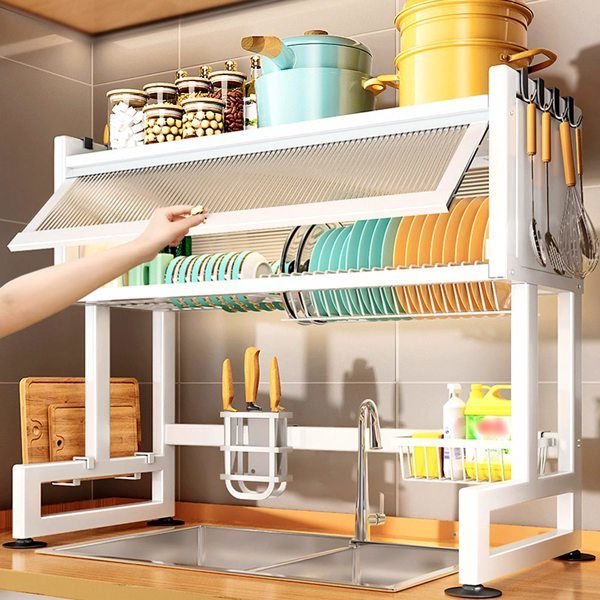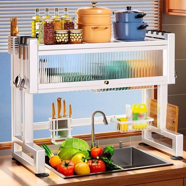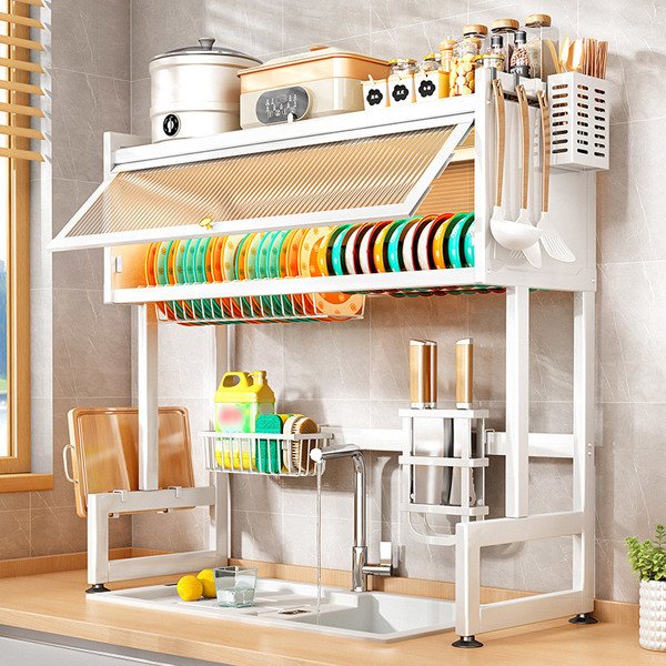 Fast Shipping From USA, Delivered In 3-5 Business DaysGold-plated handle, flip cover can hover, more convenient and durable to open the doorL-shaped base and feet, double reinforcement with strong suction cupOrganize Your Kitchen&Automatic Drainage: 2 tiered expandable rack provides more space without costing more counter top space making it very convenient. Can meet the needs of any kitchenware, it would be a great kitchen organizer. While the over the sink design enables it to drain water directly into the sink, not onto the countertop, effectively avoiding water pooling. Besides, the non-slip mat on the bottom effectively ensure the stability of the dish rack.Good load-bearing Capacity: The over the sink dish drying rack is a high-quality and durable metal structure with a white coating on the surface. It has excellent resistance to a wide range of atmospheric conditions, is 24-hour salt tested, has a 50-pound load and is strong enough to hold the weight of a plate on the counter.L-shaped Base: Compared with traditional U-shaped and H-shaped over sink dish drying rack, it is more stable, and the design above the sink enables it to drain water directly into the sink, effectively avoiding water accumulation.Multi-layer Storage: The over the sink dish drying rack adopts the upper and lower double storage design, which increases the storage capacity, you don't have to worry about buying the wrong size, it is very suitable for large families, it can accommodate a variety of cooking utensils, all these parts can be removed and reset.Easy to Assemble: Equipped with both a wrench, no additional tools are required, and it is easy to install.